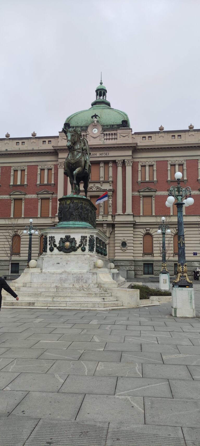 Lo que se puede observar detrás de esta estatua es la Antigua Estación de Tren de Belgrado, un edificio también muy bonito.